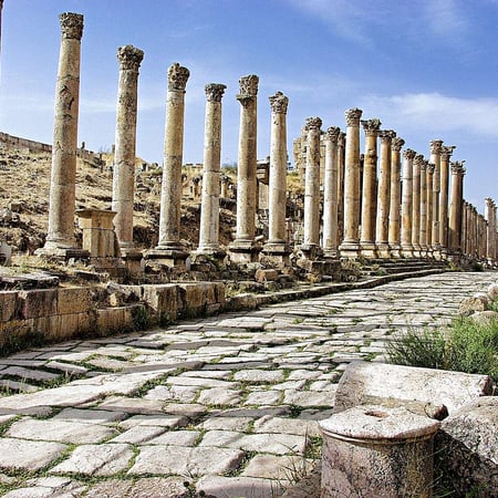 Oggi, tra Amman e i suoi dintorni, faremo un primo tuffo nella storia antica di questa splendida terra. Al mattino ci dirigiamo a Jerash, chiamata anche la “Pompei d’Oriente”, e non facciamo fatica a capire il perché. Visitiamo il Teatro sud, il Tempio di Zeus, l’imponente tempio di Artemide e il Ninfeo. Camminiamo poi sul Cardo Maximo che ancora oggi mostra i segni lasciati dalle bighe.